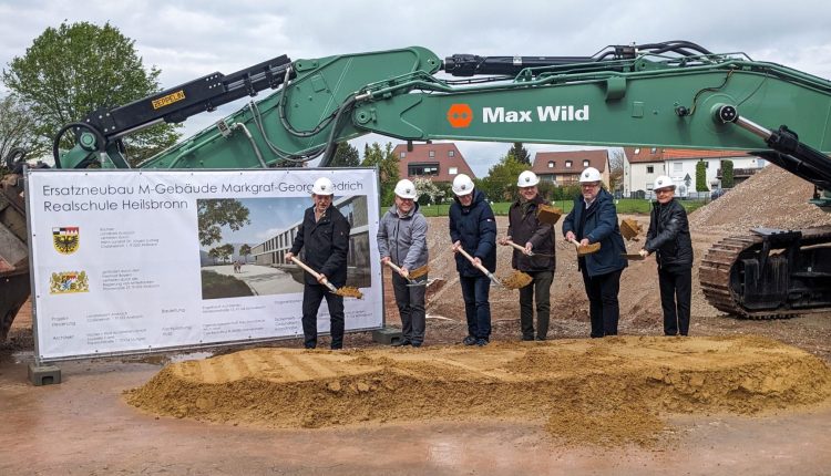 Heilsbronn, 22. April 2024 – Das ehemalige M-Gebäude der Markgraf-Georg-Friedrich Realschule in Heilsbronn wurde bereits abgerissen, die Baugrube ist vorbereitet. Nun fand auch der offizielle Spatenstich für den Ersatzneubau statt.