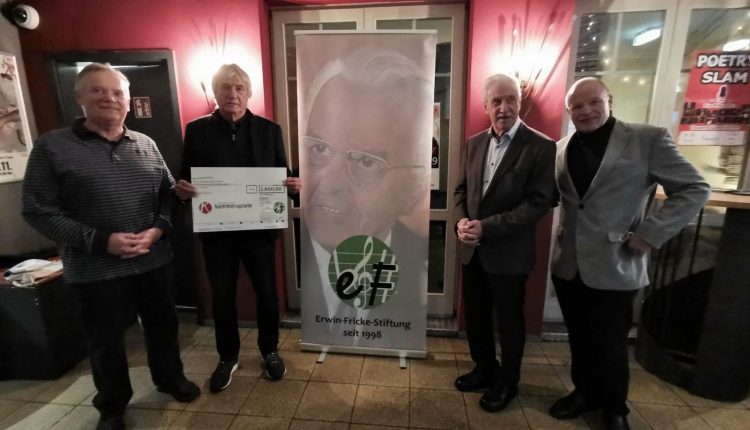 In diesem Jahr übergab die Stiftung, vertreten von Herrn Hayduk, Herrn Lecher und Herrn Herrmann, 3.600 € an den 1. Vorsitzenden der Kammerspiele, Wolfgang Bartusch. Herr Hayduk betonte die seit vielen Jahren bestehende Unterstützung des Kulturvereins. Im Laufe der Jahre wurden die Kammerspiele bereits mit Spendengeldern in Höhe von über 65.000 € aus dem Fördertopf der Stiftung bedacht. Da die Kammerspiele auch immer wieder eine Bühne für aufstrebende Nachwuchskünsler ist, seien die Mittel im Sinne des Gründers Erwin Fricke an der richtigen Stelle platziert, so Hayduk. Die Erwin-Fricke-Stiftung besteht seit 1998 und hat sich der Förderung von Musikkultur und musikalisch begabten, jungen Personen aus der Stadt und dem Landkreis Ansbach verschrieben.