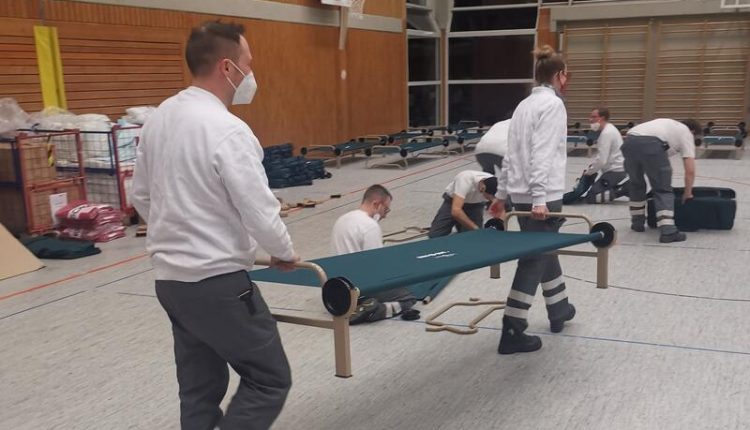 Auf- und Abbau der Notunterkunft erfolgte bzw. erfolgt durch das Bayerische Rote Kreuz. Oberbürgermeister Thomas Deffner bedankt sich herzlich für dieses außerordentliche ehrenamtliche Engagement.