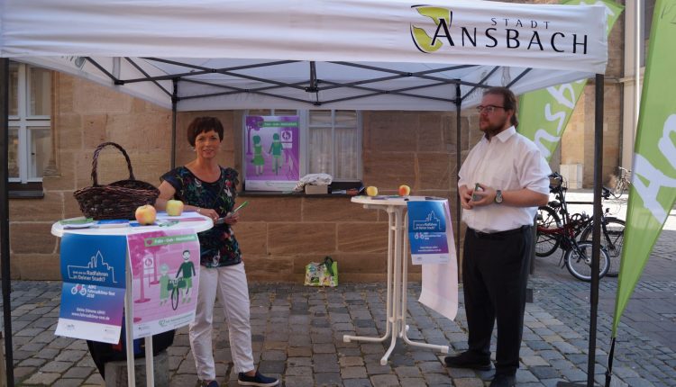 Mit der Freigabe der Fußgängerzone für Radfahrer, die der Verkehrsausschuss im Juli beschlossen hat, wirbt die Stadt Ansbach gemeinsam mit Carina e.V. und ADFC für gegenseitige Rücksichtnahme. An einem Aktionsstand in der Ansbacher Innenstadt wurde über die Freigabe der Fußgängerzone für Radler, probeweise für ein Jahr, informiert und alle Verkehrsteilnehmer um Rücksicht gebeten. „Die Fahrradfahrerinnen und Fahrradfahrer dürfen nur Schrittgeschwindigkeit fahren“, erklärt Pia Stöhr, Leiterin des Ansbacher Ordnungsamt. In den kommenden Wochen wird auch mit Plakaten und Bannern für das gemeinsame Miteinander geworben, ein Faltblatt stellt zudem die für Radfahrer nun zugänglichen Bereiche dar und erklärt die geltenden Regeln.