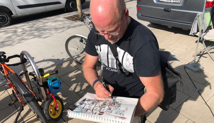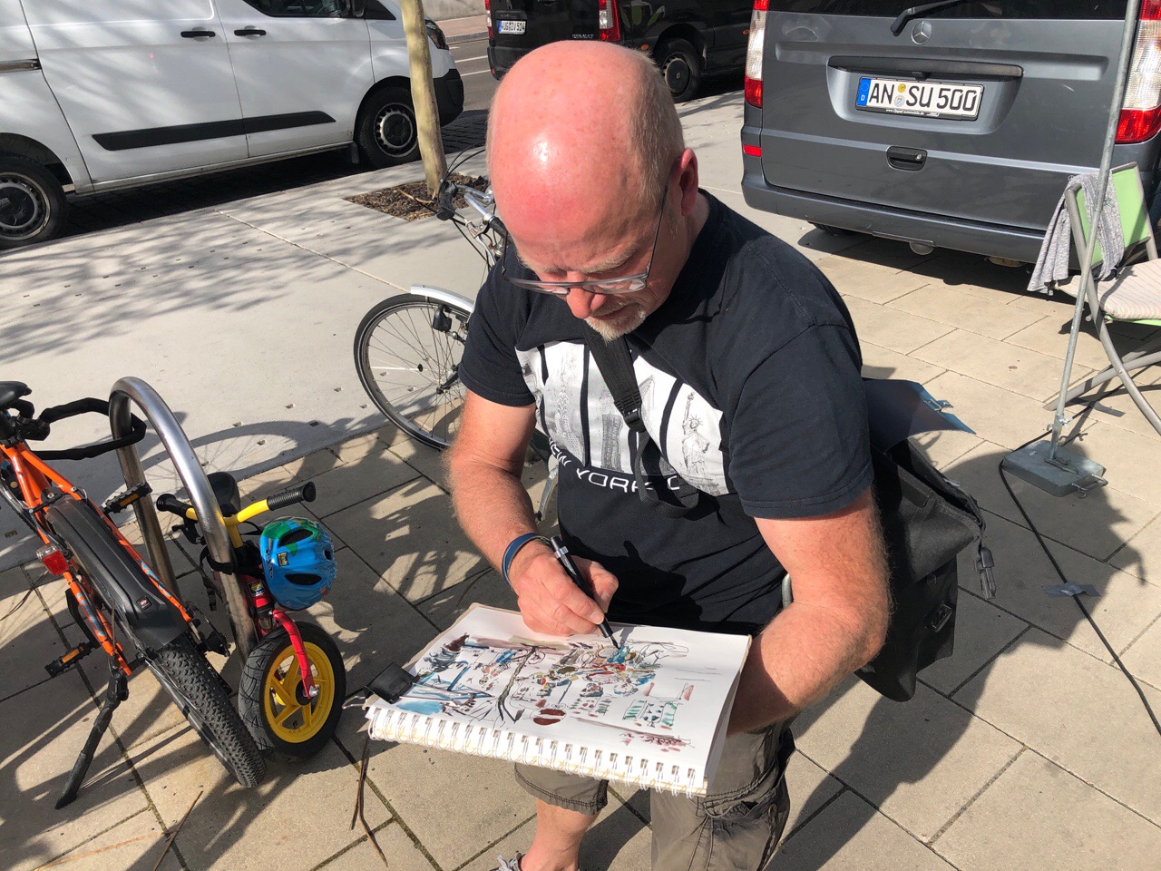 Der gebürtige Ansbacher zeigt in seinem unverkennbaren Urban-Sketching-Stil verschiedene Ansichten und Blickwinkel seiner Heimatstadt. Geprägt sind seine Werke von Füllfederhalter und Tinte, die direkt vor Ort entstehen und den Moment einfangen und festhalten. Besucher können Thomas Jungkunz vor Ort mit Abstand selbst über die Schulter schauen und sich mit ihm austauschen. Urban Sketchers bezeichnet ein Netzwerk aus Künstlern aus der ganzen Welt, die ihre Städte und Orte, in denen sie leben oder zu denen sie reisen, im jeweiligen Moment festhalten.