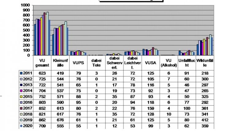Im Dienstbereich der PI Treuchtlingen wurden im Berichtsjahr 709 (Vorjahr 862) Verkehrsunfälle registriert und bearbeitet, was einen Rückgang von 17,7 % bedeutet. Ähnlich rückläufige Unfallzahlen waren auch im Bund, in Bayern, Mittelfranken und dem Landkreis zu beobachten, was sicherlich dem stark rückläufigen Verkehrsaufkommen durch die Corona-Lage zuzuschreiben ist. Bei den aufgenommenen Verkehrsunfällen waren 555 sogenannte Kleinunfälle (78,3 %), von denen wiederum 359 (2019: 412) aus Zusammenstößen mit Wild resultierten. Somit handelte es sich bei über der Hälfte aller Verkehrsunfälle im Bereich der PI Treuchtlingen um sog. Wildunfälle (50,6 %). Schlüssige Erklärungsansätze für die beständig hohe Zahl von Wildunfällen, die zwar im Jahr 2020 zurückgegangen sind, aber immer noch auf hohem Niveau verharren, können hier jedoch auch die für die Jagd Verantwortlichen, beziehungsweise die Verkehrsunfallkommission nicht liefern.