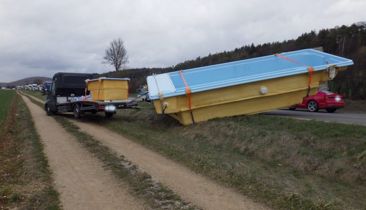 Das Kunststoffbecken wurde durch den Verkehrsunfall erheblich beschädigt. Der Abschleppdienst stellte den Anhänger wieder auf die Räder und der 29-Jährige konnte langsam bis zu einer Werkstatt in Treuchtlingen weiterfahren.