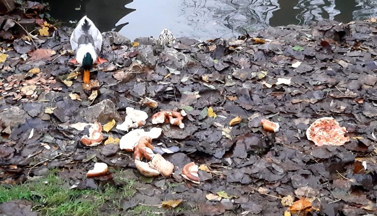 Leider sieht man nur zu oft, dass Brötchen, Brotscheiben oder ganze Brotlaibe, Laugengebäck , Pizza und andere Lebensmittel in die Weiher und andere Gewässer geworfen werden, um Enten zu füttern. Dies ist unnötig, da die Tiere selbst genügend Nahrung finden.
