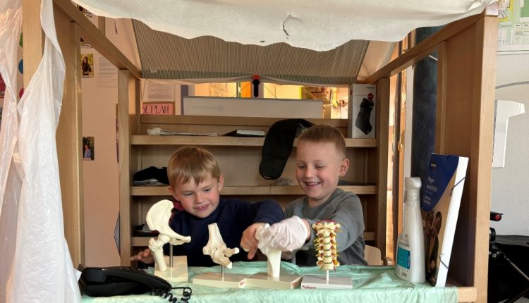 Neuendettelsau, 14. Mai 2024 – Wer in die Integrative Kindertagesstätte Bunte Oase in Neuendettelsau kommt, hört momentan häufiger Sätze wie „Ich habe mir das Bein gebrochen und brauche Krücken“ oder „Hilf mir mal bitte mit den Schienen“. In einem kleinen Sanitätshaus können die Kita-Kinder spielerisch Verbandszeug, Krücken oder auch einen Rollstuhl kennenlernen.