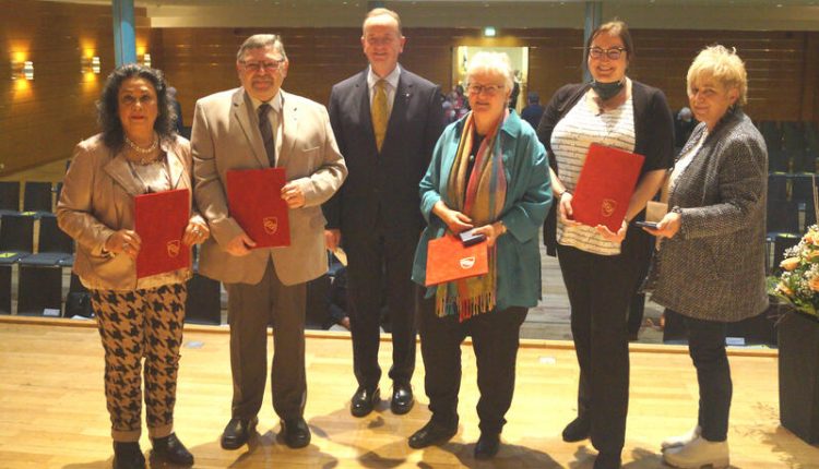 Ansbach, 25. März 2022 – Oberbürgermeister Thomas Deffner verleiht im Namen der Stadt Ansbach das Ansbacher Stadtsiegel von 1532 an Villy Wiegel, Susanne Wolf, Hildegard Nefzger und Fritz Heubeck für ihren langjährigen ehrenamtlichen Einsatz für die Allgemeinheit.