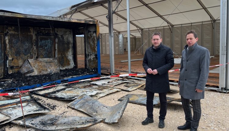 Landrat Dr. Jürgen Ludwig machte sich heute gemeinsam mit dem 1. Bürgermeister Stefan Ultsch ein Bild von der derzeit im Aufbau befindlichen Flüchtlingsunterkunft auf dem Festplatz in Wassertrüdingen. Rund 140 Einsatzkräfte der Freiwilligen Feuerwehren aus dem Landkreis Ansbach und den angrenzenden Landkreisen Weißenburg-Gunzenhausen sowie Donau-Ries waren im Einsatz, um das Feuer zu löschen.